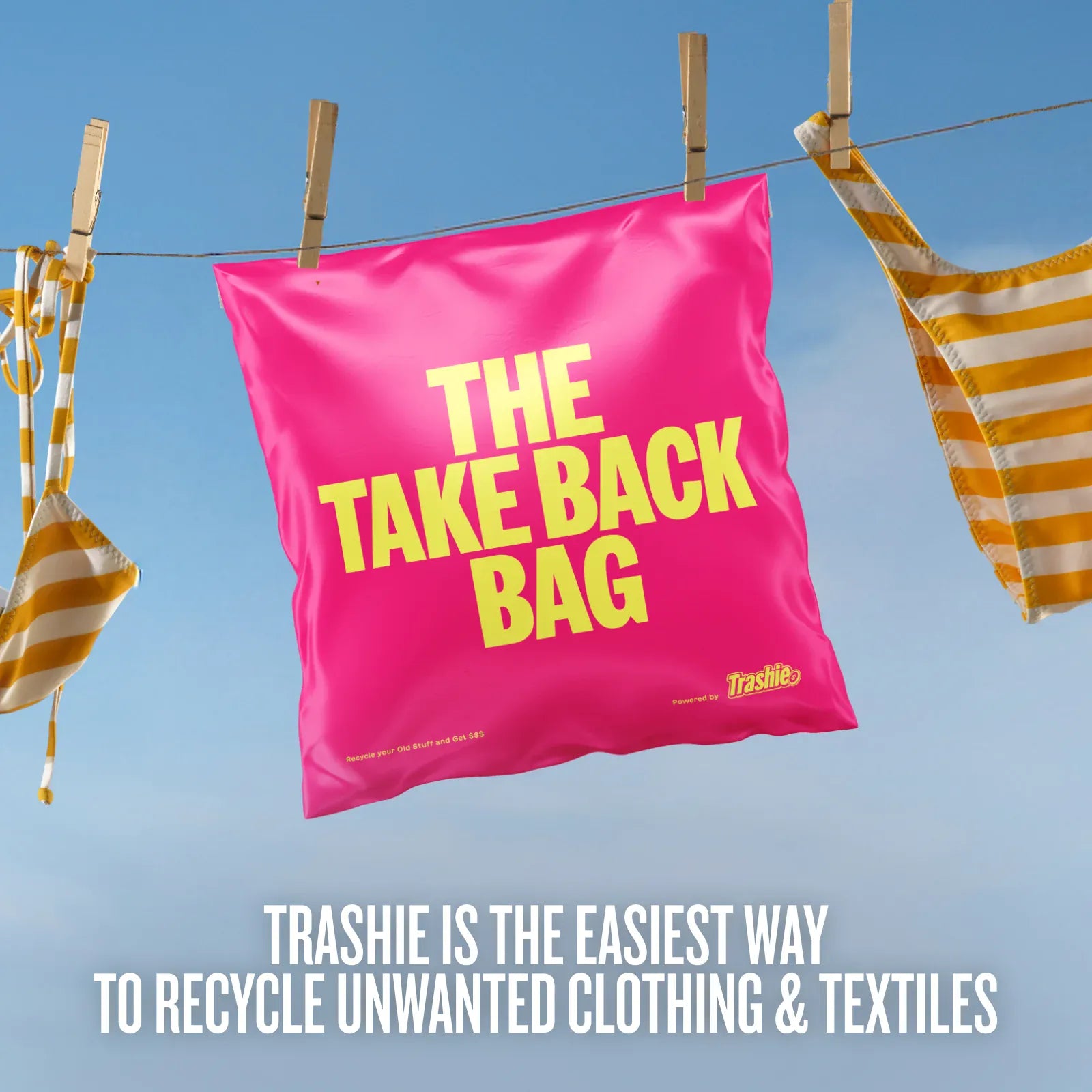 Simply fill your Trashie Take Back Bag™ with unwanted clothing. textiles. or cosmetic bags to keep them out of landfills and sent for proper recycling. upcycling. or reuse. You’ll receive an exclusive gift next time you shop with us.