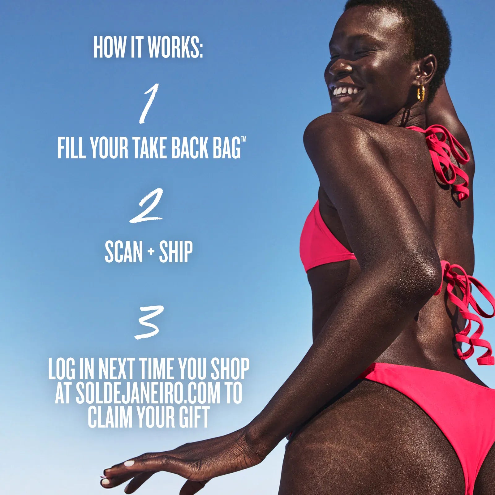 *Free deluxe Brazilian Glossy™ Nourishing Hair Oil sample and three sample packettes on your next order with purchase of one Trashie Take Back Bag™. One free gift per qualifying purchase. Free gift will automatically be added to your account once the Trashie Take Back Bag™ is purchased and will be eligible to redeem on your next order. No code needed. Must be logged into your account and purchase one paid item to redeem. Offer valid subject to availability. Offer not valid on previous purchases. Not valid for cash or credit. Offer subject to change at any time and without notice. Sol de Janeiro has the right to cancel any orders due to unauthorized use of our website or violation of our Terms of Service. Offer valid while supplies last.